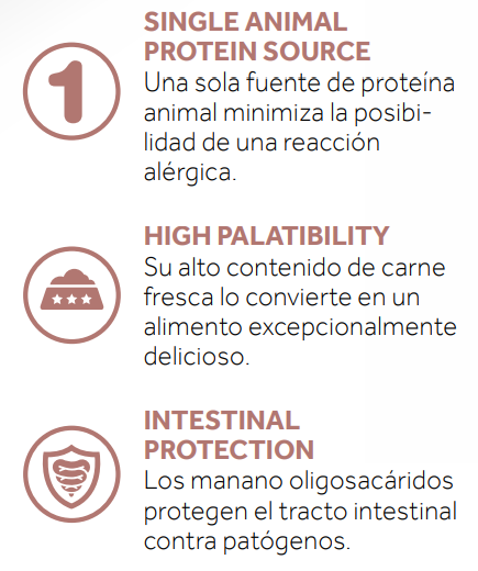 Está diseñado para cubrir todas las necesidades nutricionales durante el crecimiento, al tiempo que protege el sistema digestivo y cutáneo de los cachorros sensibles. Esta dieta hipoalergénica ayuda a aliviar síntomas como diarrea, vómitos, picor y enrojecimiento de la piel asociados a la sensibilidad alimentaria.