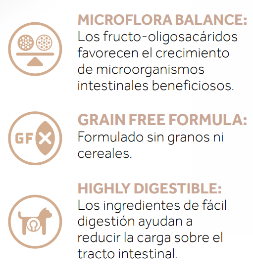 También contiene un nivel moderado de grasa y fibra para apoyar la salud gastrointestinal, además de electrolitos y nutrientes que ayudan a recuperar el equilibrio digestivo. Ideal para perros con estómagos sensibles, en fase de recuperación o con enfermedades gastrointestinales diagnosticadas.
