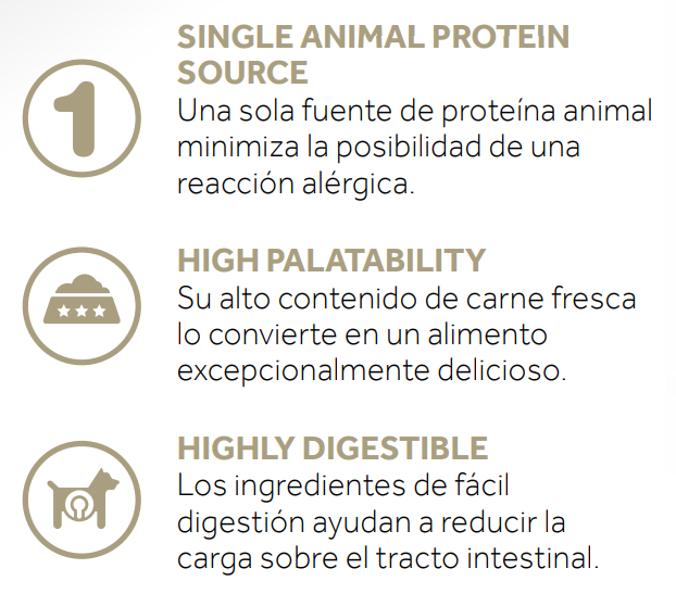 | Opción Nutricional: | Alimento completo, Monoproteico, Hipoalergénico |