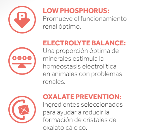 Su bajo contenido en fósforo y proteínas de alta calidad ayuda a reducir la carga renal, mientras que su composición contribuye a un ambiente urinario menos favorable para la formación de cristales de oxalato.